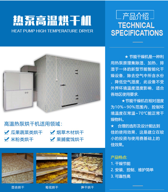 同恩牌熱泵干燥機(jī)是一種利用熱泵原理集除濕、加熱,排濕于一體的新型節(jié)能智能化干燥設(shè)備,來(lái)除去空氣中所含水份,降低空氣濕度,此設(shè)備不受外界環(huán)境溫度濕度影響,適合各地區(qū)使用要求。機(jī)器采用我公司回?zé)嵫h(huán)熱泵除濕方式,拓寬了除濕機(jī)在工業(yè)干燥領(lǐng)域的應(yīng)用,干燥性能比普通熱泵除濕干燥節(jié)能30%以上,大大節(jié)約運(yùn)行費(fèi)用;中高溫干燥方式(常溫~70℃),接近自然干燥,被干物品的品質(zhì)好、色澤好、產(chǎn)品等級(jí)高,無(wú)污染,而且***環(huán)保衛(wèi)生要求。干燥過(guò)程中物料不變形、不開(kāi)裂、不變色、不變質(zhì)、不氧化、干燥徹底、干燥后復(fù)水性好、營(yíng)養(yǎng)成分損失少,儲(chǔ)存期長(zhǎng),比任何傳統(tǒng)干燥設(shè)備更有效地保護(hù)干燥物的色、香、味、個(gè)體形態(tài)和有效成分。采用送風(fēng)循環(huán)脫水并實(shí)現(xiàn)物料快速干燥。機(jī)組采用觸摸屏全自動(dòng)控制方式(帶有溫濕度設(shè)定,機(jī)器故障顯示及工作模式和設(shè)定定時(shí)開(kāi)關(guān)機(jī)、循環(huán)開(kāi)關(guān)機(jī)以及時(shí)空模式等),性能穩(wěn)定,操作方便。根據(jù)客戶需要,可設(shè)定不同干燥曲線,滿足不同種類(lèi)物料干燥,具有適用范圍廣,干燥效果顯著,外形美觀,結(jié)構(gòu)緊湊,功能齊全,運(yùn)行寧?kù)o,機(jī)組獨(dú)立放置在庫(kù)房外,易維護(hù)及操作,延長(zhǎng)設(shè)備使用壽命。